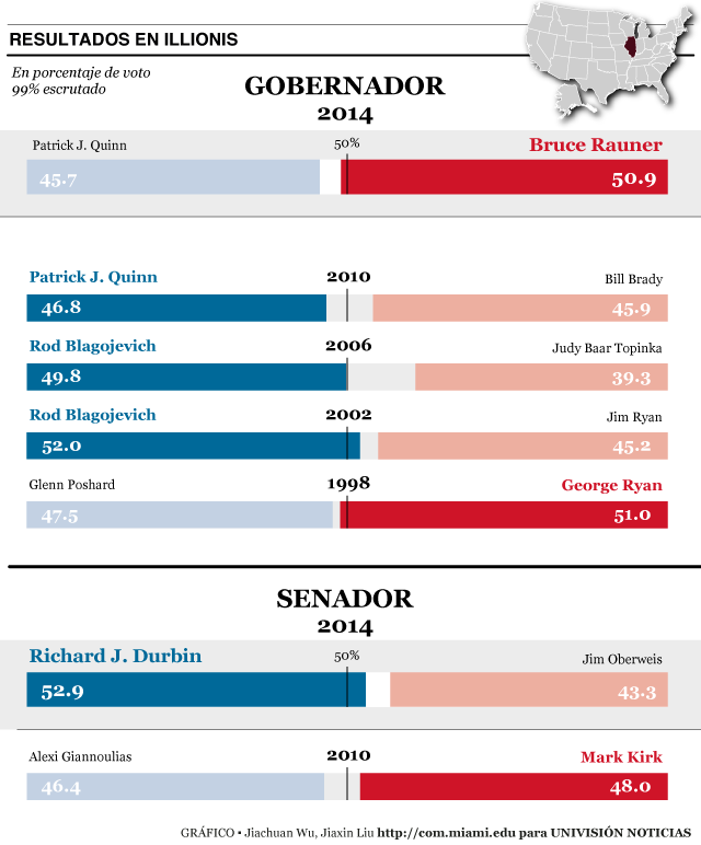 Before the whole night in newsroom, we has already began our work. First, weeks ago we collected hot topics related to the candidates in each states. Since Univisión is the largest news company serving Hispanics and Americans in U.S., we mainly focus on states have Hispanic votes and Hispanic candidates. After reviewing past election results for House, Senate and Governor in Illinois, Florida, Colorado and etc., we process data and made graphic by Illustrator. We created the templates and used them at the mid-term election night.