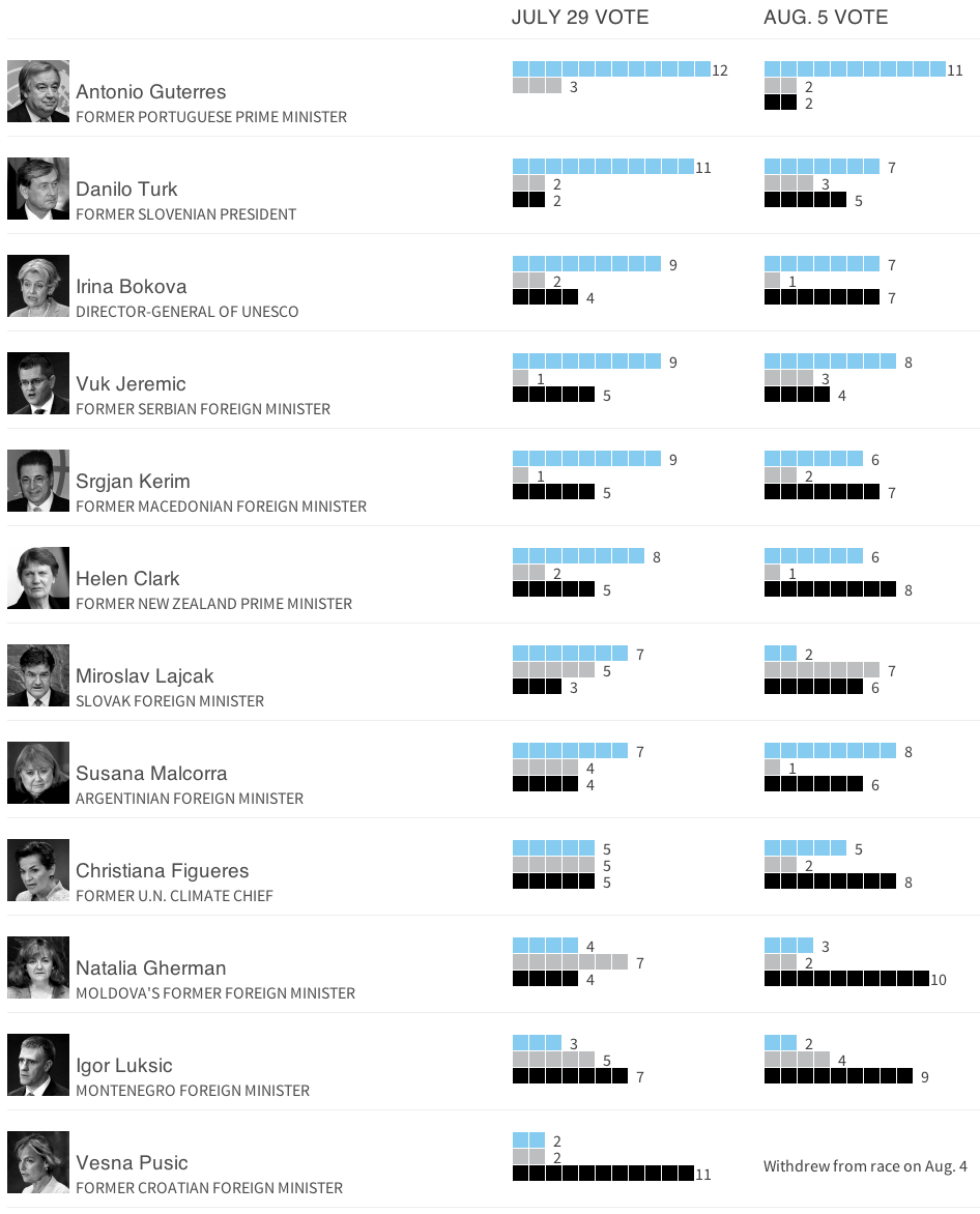 This graphic is still tracking the ballots for replacing U.N. chief Ban Ki-moon. It was set up at July 2016. The 15-member Security Council will hold secret ballots until a consensus is reached.